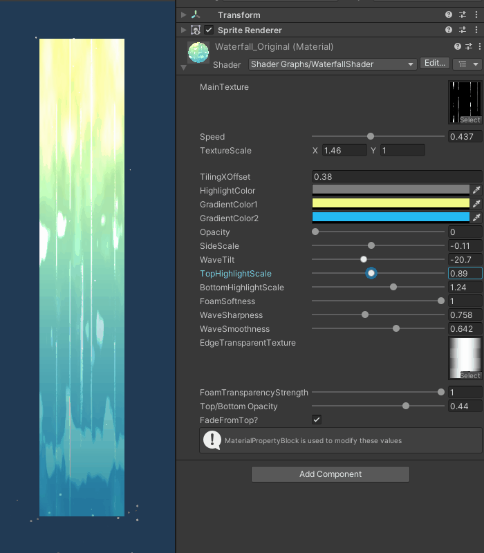For this project, I was contracted to complete 2 major tasks - create a waterfall shader, and develop a procedural 2D wave system that dynamically reacts to player collision.
